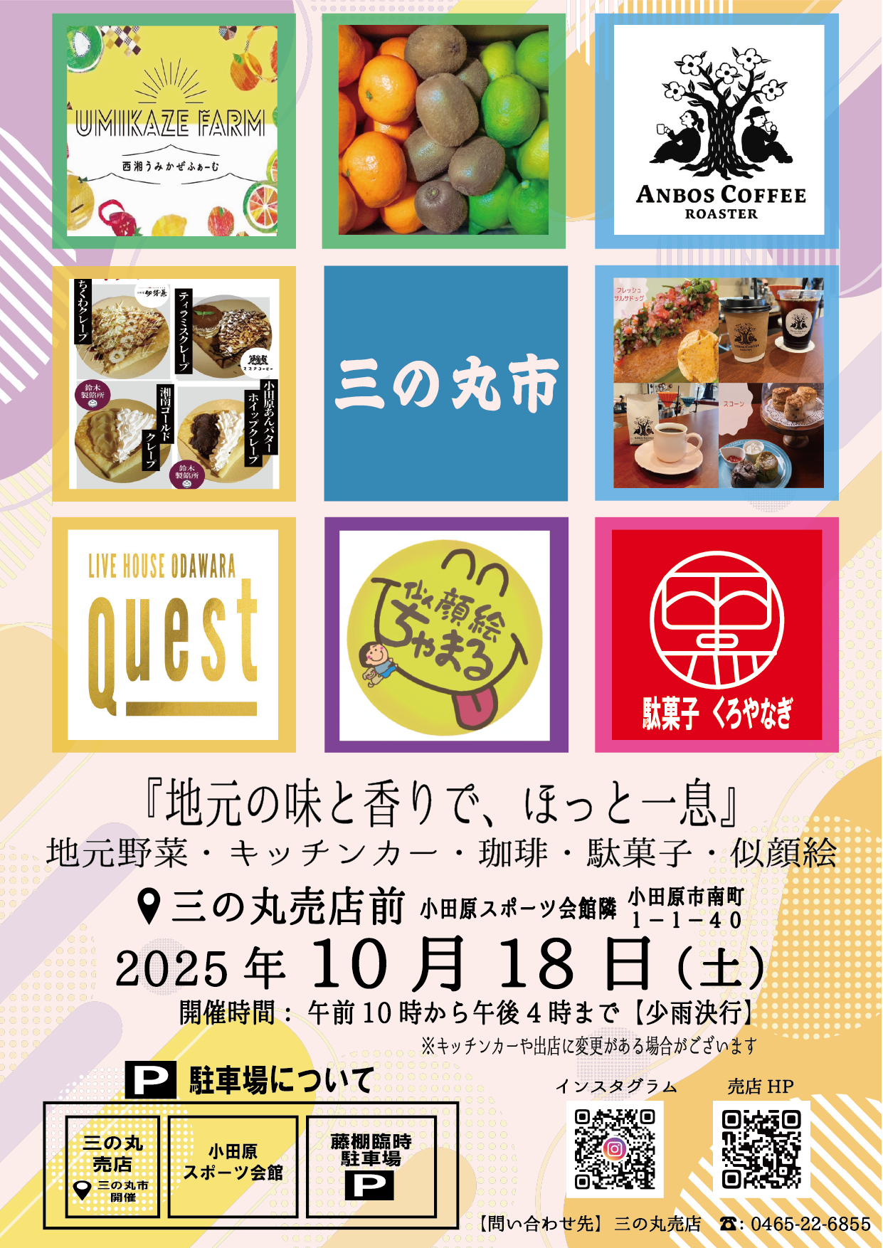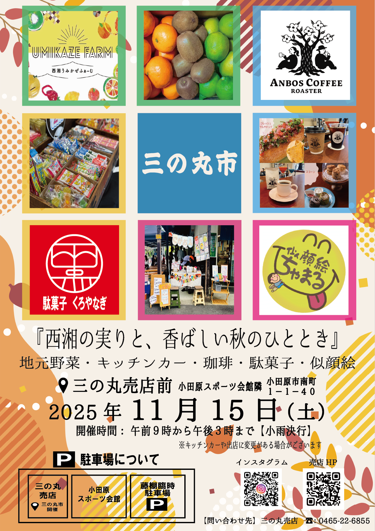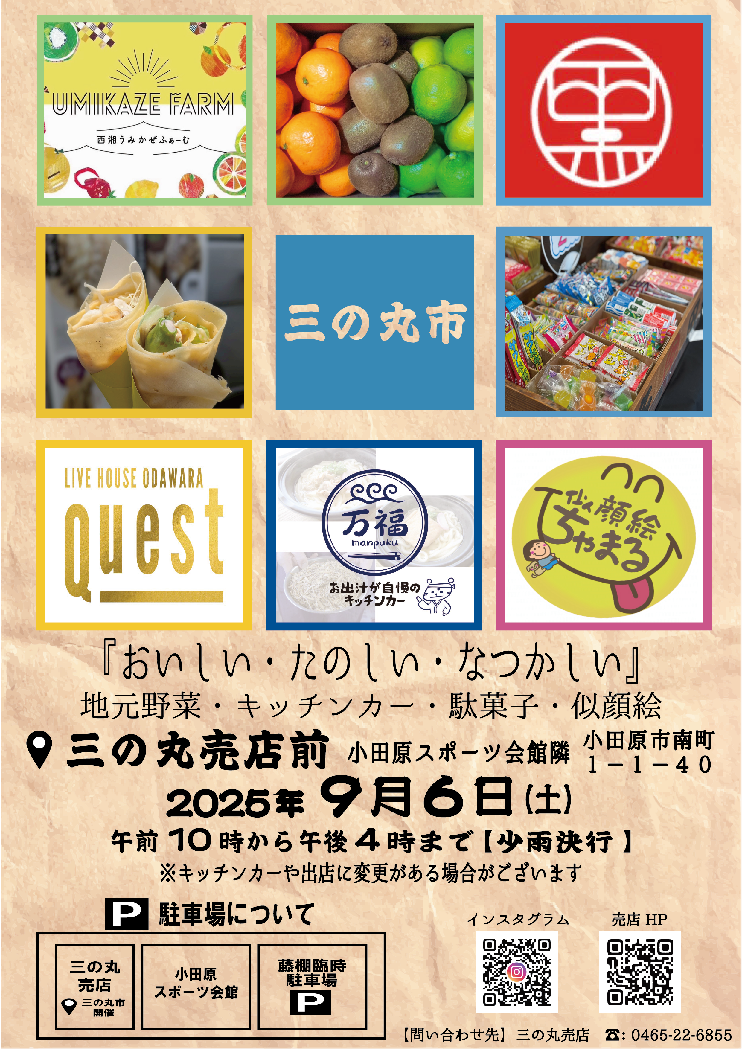 「地元野菜の西湘うみかぜファーム」、昔懐かしい「駄菓子のくろやなぎ」、「似顔絵ちゃまる」が前回に引き続き出店します。その他、コーヒー、パン屋やキッチンカーも出店予定となっていますので、ぜひお越しください。