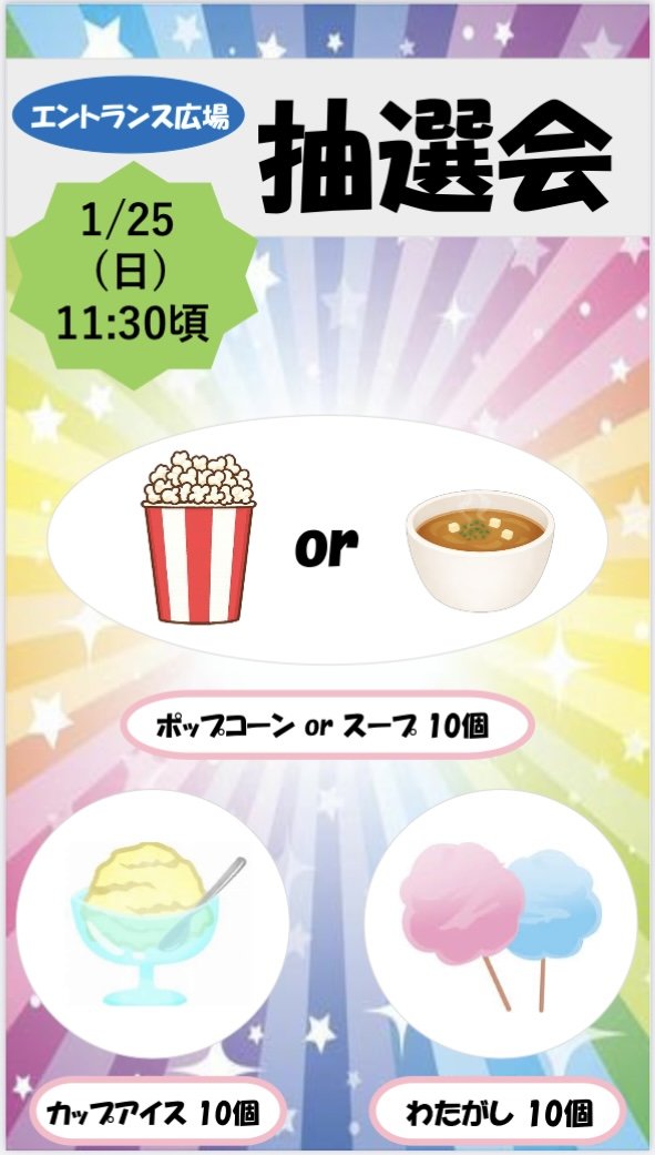 ポップコーンまたはスープ・カップアイス・わたがし が30人に当たります!!
